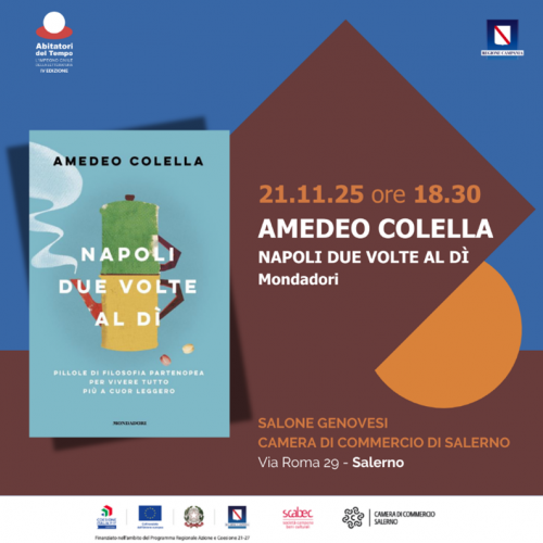 Amedeo Colella sarà ospite di “Abitatori del tempo. L’impegno civile della letteratura” venerdì 21 novembre alle ore 18.30, nel suggestivo Salone Genovesi della Camera di Commercio di Salerno. L’incontro, parte di un ciclo dedicato al rapporto tra scrittura e responsabilità etica, si propone di indagare il ruolo dell’autore come osservatore critico del presente e custode della memoria collettiva.