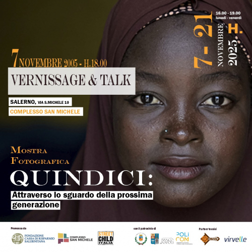 Venerdì 7 novembre 2025, ore 18.00, al Complesso San Michele, si terrà l’evento di inaugurazione della prima esposizione italiana della Mostra fotografica documentaria “QUINDICI: Attraverso lo sguardo della prossima generazione”, promossa da Fondazione Carisal in collaborazione con Street Child Italia e con il patrocinio di Comune di Salerno, Fondazione Banco di Napoli e DISPC Università degli Studi di Salerno e con partener tecnici Pavoni e Virvelle srl.