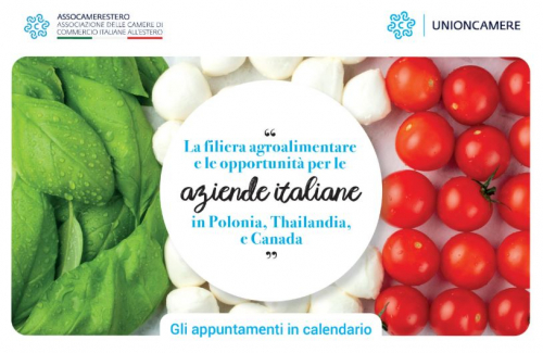 Assocamerestero, nell'ambito del Fondo intercamerale di Intervento di Unioncamere, propone 3 webinar rivolti alle aziende italiane del settore agroalimentare nell'ambito del progetto SEI https://www.sostegnoexport.it/ per presentare scenari e opportunità per le nostre produzioni sui seguenti mercati esteri: Polonia, Thailandia e Canada.