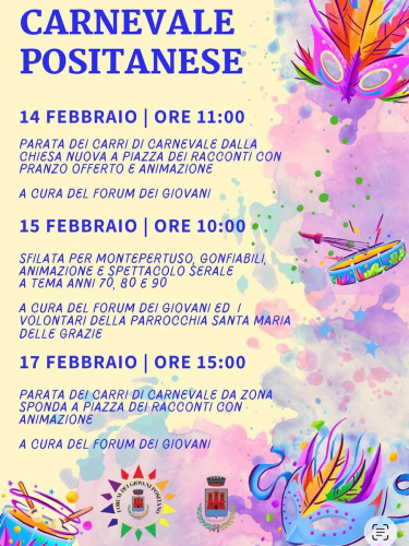 Dal 14 al 17 febbraio Positano si veste di colori e allegria per celebrare il Carnevale, trasformando il borgo in un palcoscenico a cielo aperto tra maschere, musica e momenti di condivisione. Un appuntamento atteso da grandi e piccoli, capace di unire tradizione e divertimento in un’atmosfera coinvolgente e festosa.