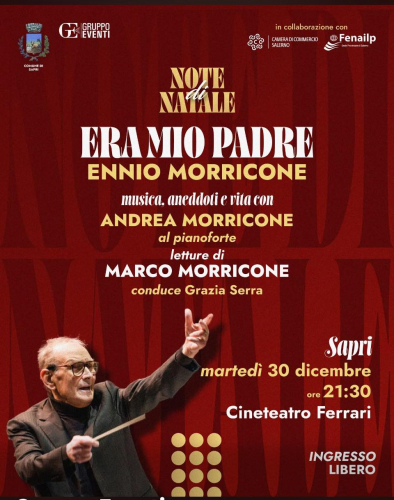 Martedì 30 dicembre 2025, il Cineteatro Ferrari di Sapri sarà teatro di un evento straordinario dedicato alla memoria e all’arte di Ennio Morricone, uno dei più grandi compositori italiani di tutti i tempi. L’iniziativa, intitolata “Note di Natale: era mio padre”, sarà un’occasione unica per rivivere le emozioni e i racconti legati alla vita e alla carriera del Maestro, attraverso le parole dei suoi figli Andrea e Marco Morricone e la conduzione di Grazia Serra.