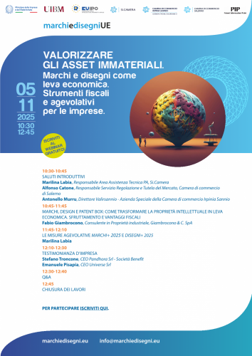Il Ministero delle Imprese e del Made in Italy (UIBM), in collaborazione con EUIPO, Si.Camera, la Camera di Commercio Irpinia Sannio e la Camera di Commercio di Salerno, promuove il webinar gratuito sulla valorizzazione degli asset immateriali.
